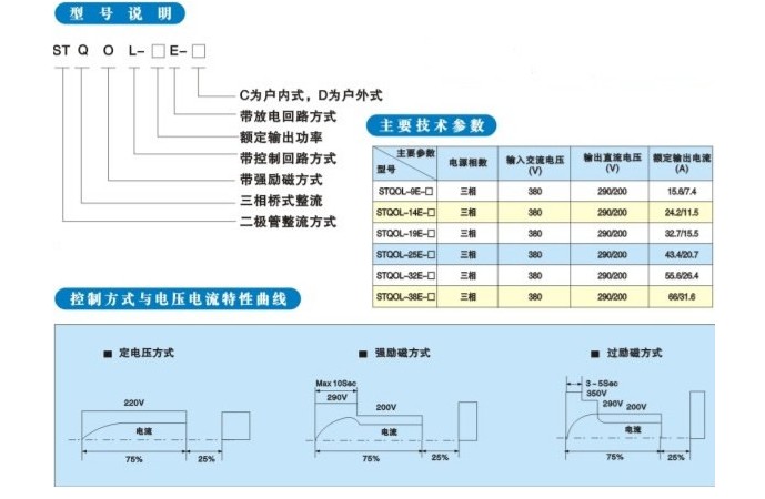本系列產品當容量小于或等于19千瓦時,整流變壓器外附;當容量大于或等于25千瓦時,分為整流控制設備和強勵磁控制設備,整流變壓器內附于強勵磁控制柜內。